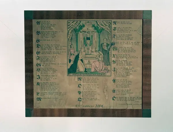 Färglagt litografiskt blad: " Ett gyldene ABC"; bibeltexter för varje bokstav samt bild ( två knäböjande kvinnor framför krucifix, två män). "No 56 a P. A. Huldberg Regeringsg. No. 11."
