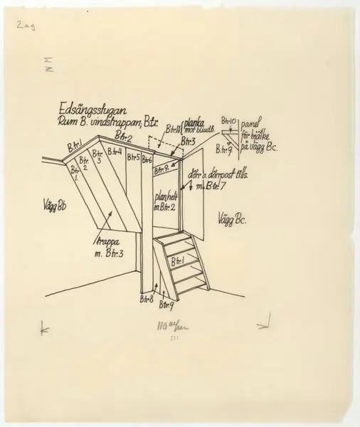 Delsbogården. Uppmätningsritning. Edsängsstugan. Rum B, vindstrappan.