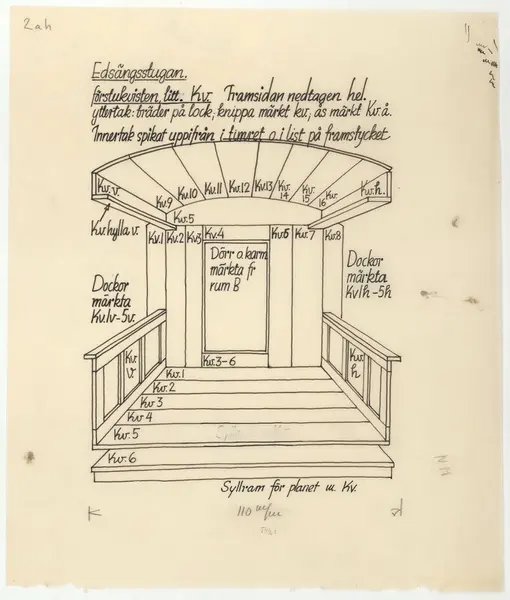 Delsbogården. Uppmätningsritning. Edsängsstugan. Förstukvist.