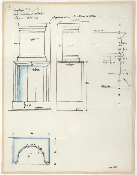 Delsbogården. Uppmätningsritning. Sunnanåssängstugan. Spis i innerkammaren på övervåningen.