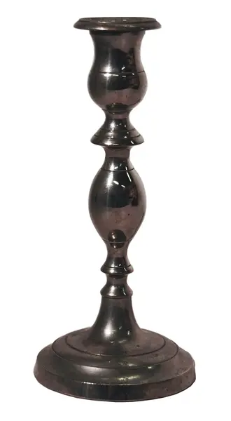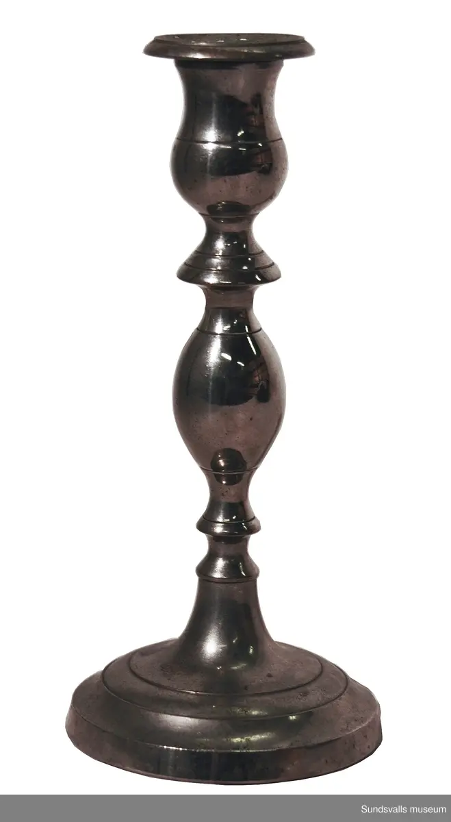 Ljusstake i gul metall, förnicklad. Stämplad i botten: 'N.P.L 20', troligen klockgjutaren Nils Petter Linderberg, Sundsvall.