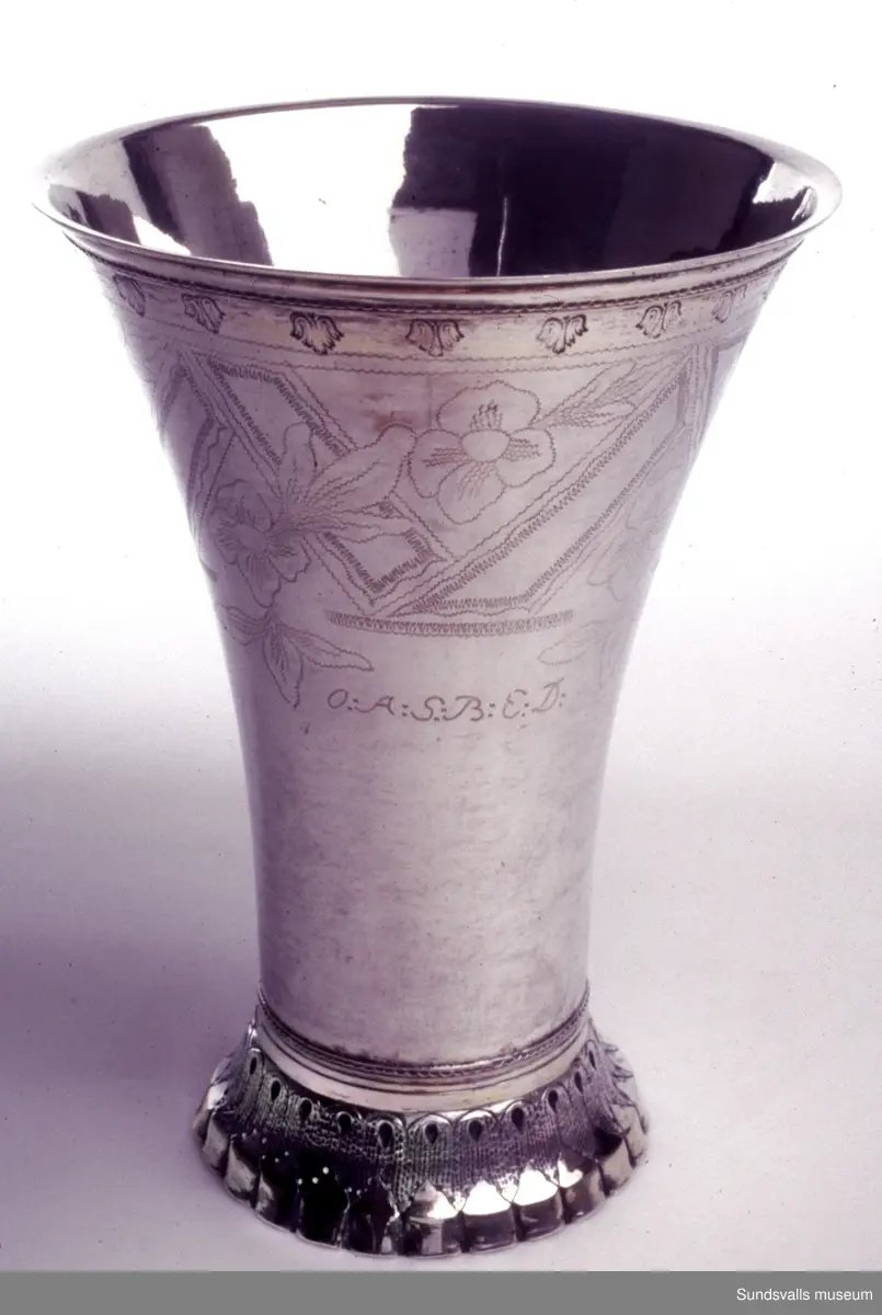 Bägare, delvis förgylld. Konisk form, insvängd. Fotring delvis godronnerad, delvis med punsad dekor. Vågband runt fot och mynning. Vid mynningen stämplad lambrequin. Svisselerad dekor föreställande blommor och vågband på livet. Stplr: Hans Langberg, Söderhamn, 1797.