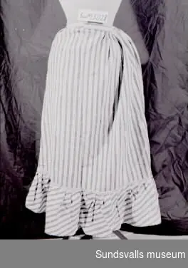 Kjol av hemvävt tyg med blå, röda och vita ränder. Smal linning med hyskknäppning. Påsydd volang längst ner. Sömmen till denna göms bakom ett randigt band i gult, blått och rosa. Kjolens ursprungliga ägare är givarens farmor, Elsa Lena Pettersson, född 1866 i Norra Råda, Värmland, död 1942. Den användes också vid 100-årsminnet av 1879-års strejk i Sundsvall av Mona Hillman eller Margareta Johan...