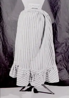 Kjol av hemvävt tyg med blå, röda och vita ränder. Smal linning med hyskknäppning. Påsydd volang längst ner. Sömmen till denna göms bakom ett randigt band i gult, blått och rosa. Kjolens ursprungliga ägare är givarens farmor, Elsa Lena Pettersson, född 1866 i Norra Råda, Värmland, död 1942. Den användes också vid 100-årsminnet av 1879-års strejk i Sundsvall av Mona Hillman eller Margareta Johansson.