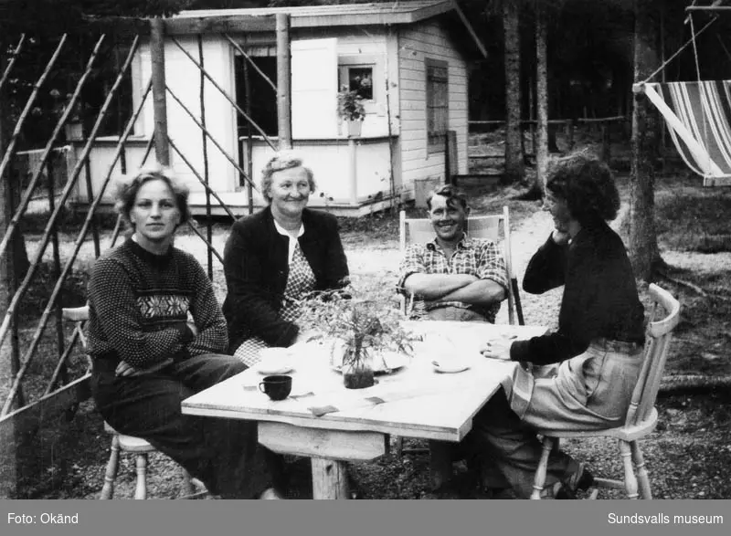 Kaffestund i bersån. Viktor Lindqvist på bordets kortända och hans syster Valborg Lindqvist ses i profil. På andra sidan bordet sitter Valborgs väninna Carina som har sin mamma med.