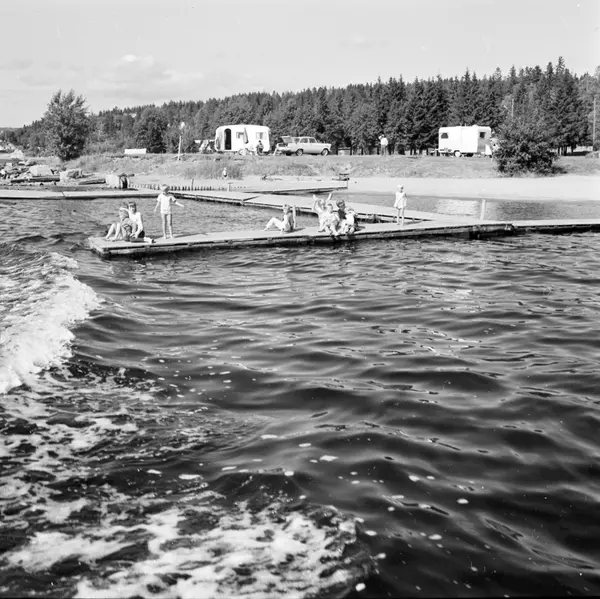 • Petersviksbadet fotograferat från sjösidan. Badbrygga med vinkande barn.