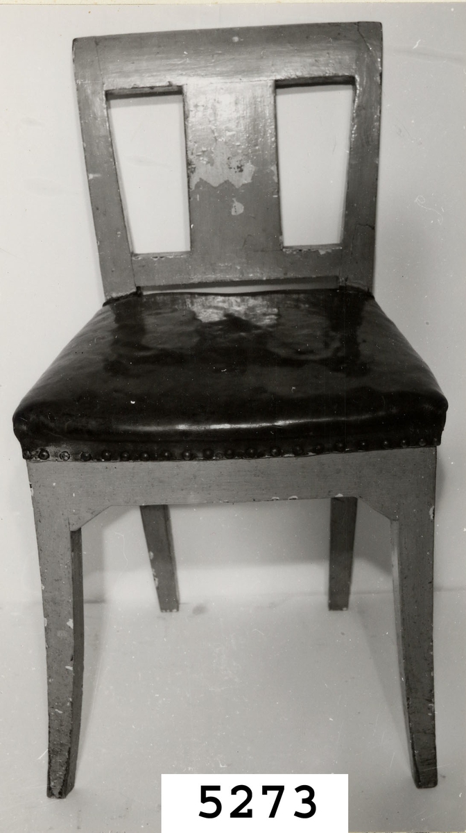 • Stol av furu, gulmålad. Svagt utsvängda framben. Trapetsformad sits klädd med ryssläder.