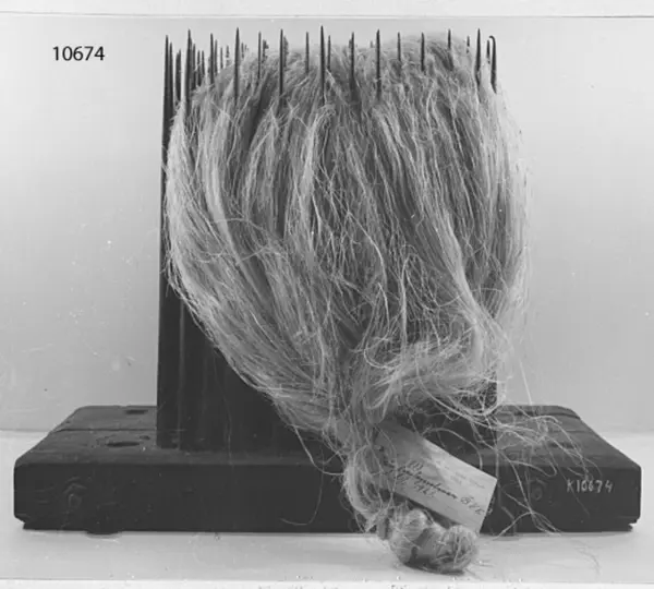 På en 50 mm tjock rektangulär bräda av furu, koniska, långa ståltaggar. fästade vertikalt i rader, så att varje tagg täcker en lucka i föregående och följande raden. Taggarna placerade i 15 rader med ...Visa hela