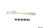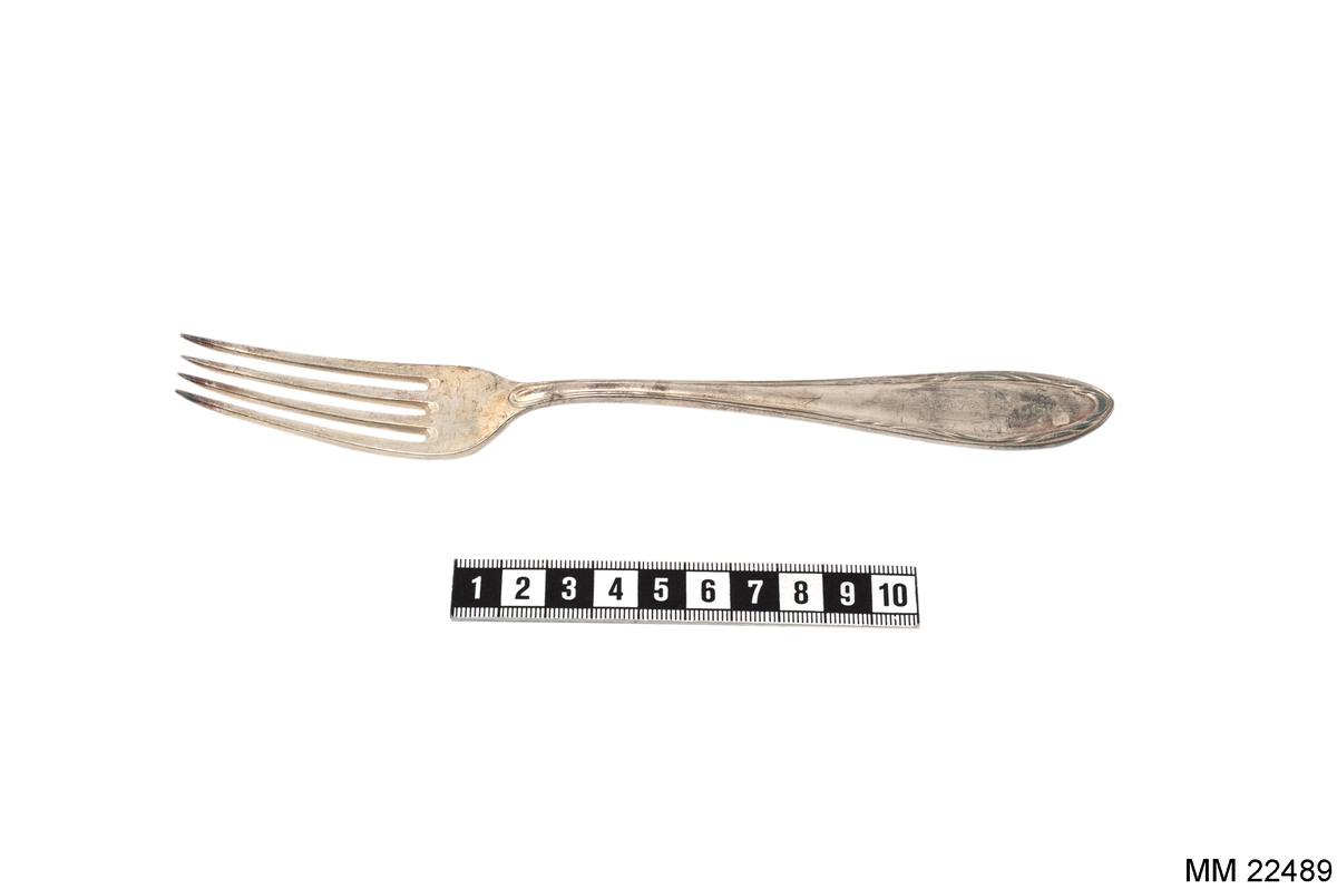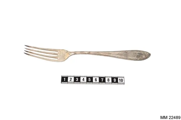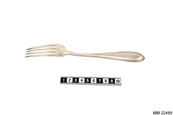 Matgaffel, skaft med vågformad slinga längs kanten.