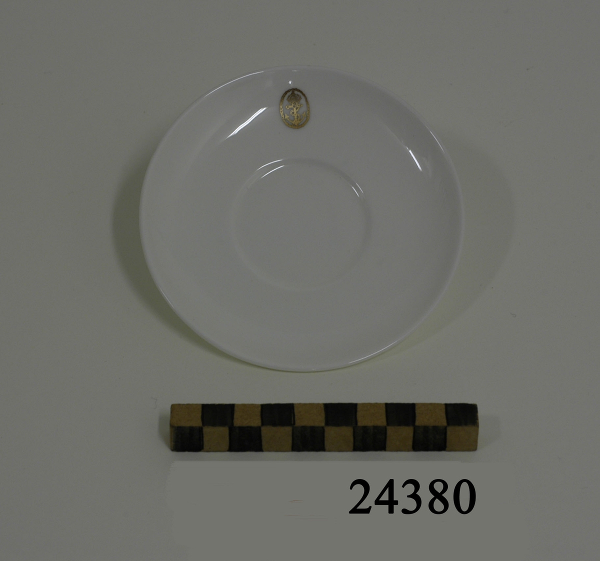 Kaffefat till mockakopp av vitt benporslin, bräm = 30 mm. På brämet förgyllt emblem: ett krönt stockankare omgivet av tågvirkeslinga. På undersidan fotring samt stämpel och text i grönt: ett stockankare, däröver " GUSTAVSBERG " under tillverkarens emblem text: " SWEDEN BENPORSLIN ".