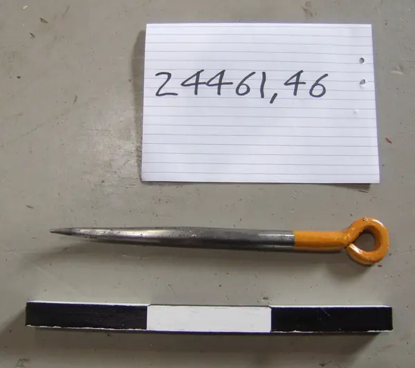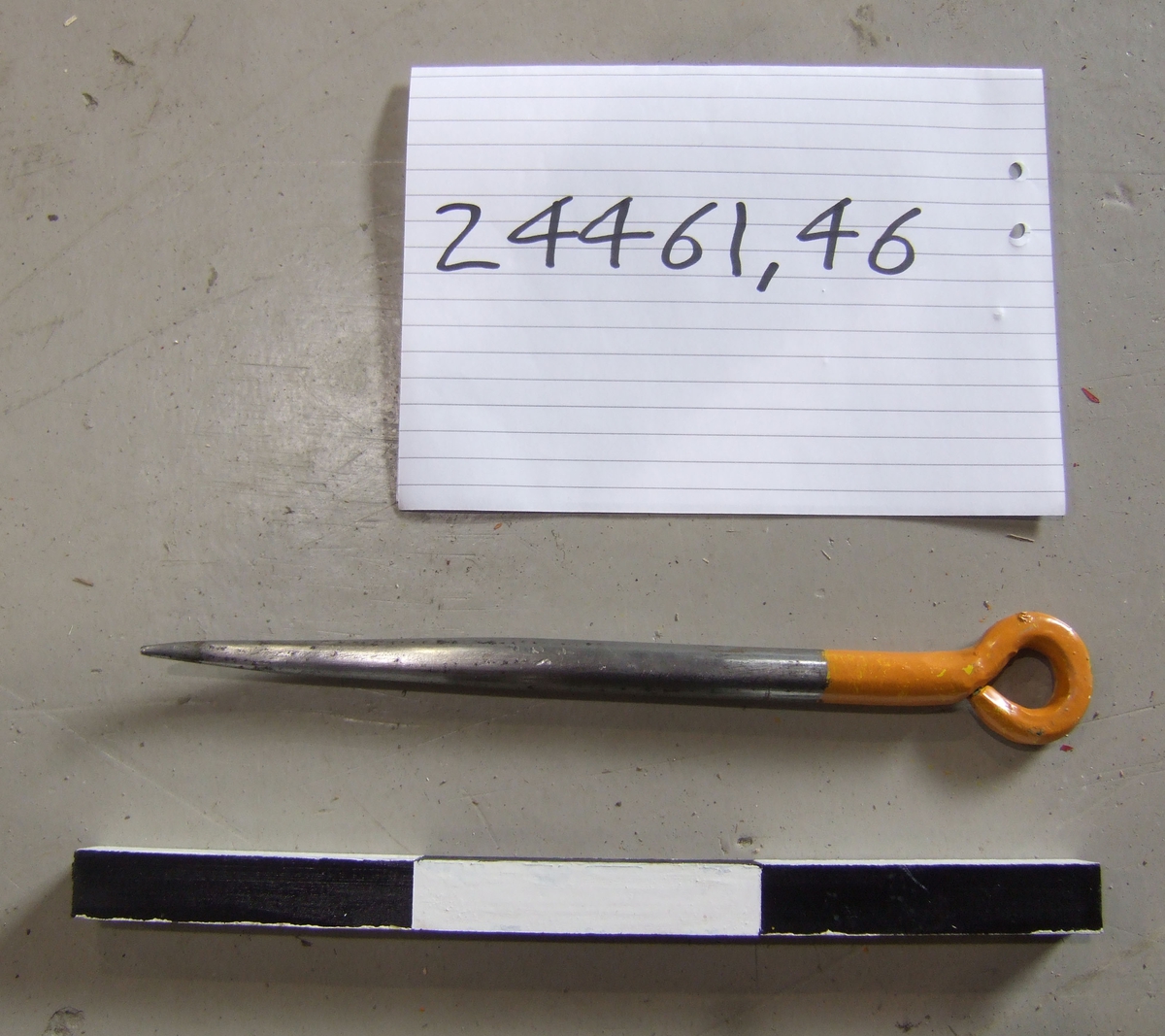 • Märlspik. Orangemålad upptill, omålad metall nedtill. Ögla högst upp.