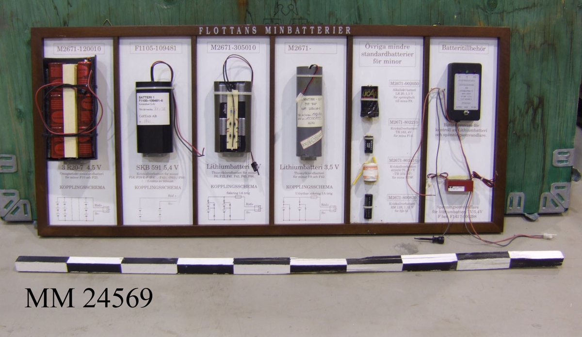 Undervisningstavla försedd med olika exemplar av minbatterier använda av Flottan. Upphängningsbar. I ramens överkant finns i vitt texten: "FLOTTANS MINBATTERIER". Upphängda på tavla finns därefter ett antal exemplar av olika minbatterier: