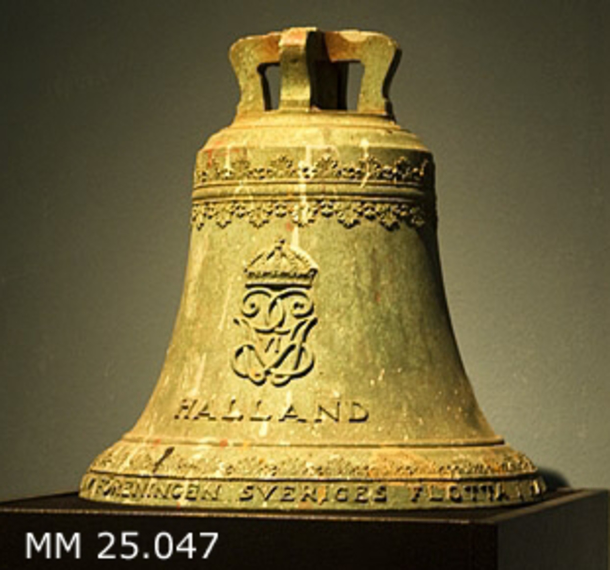 Skeppsklocka i brons. Ärgad. På ena sidan märkt "Halland" under Gustav VI Adolfs monogram. Inskription längs klockans botten: "Gåva av föreningen Sveriges Flotta i Hallands län år 1955 för jagaren Hal...Visa hela