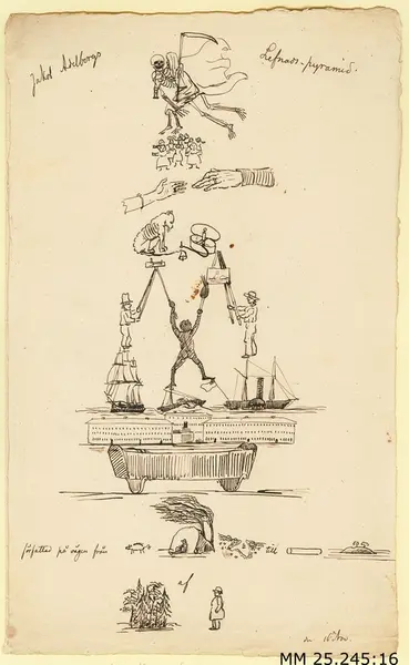 Teckning i svart penna föreställande en levnadspyramid. Symboliska bilder med följden vagga, skeppsgosse, flotta, giftermål, barn, död. Upptill signerad "Jakob Adelborgs Lefnads-pyramid". Teckningens ...