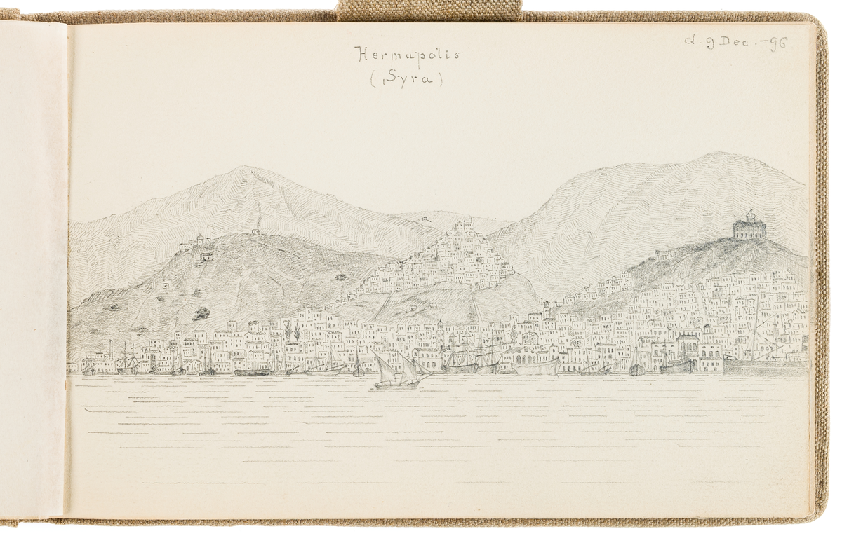 • Denna blyertsteckning föreställer en vy över Hermoupolis på ön Syros.