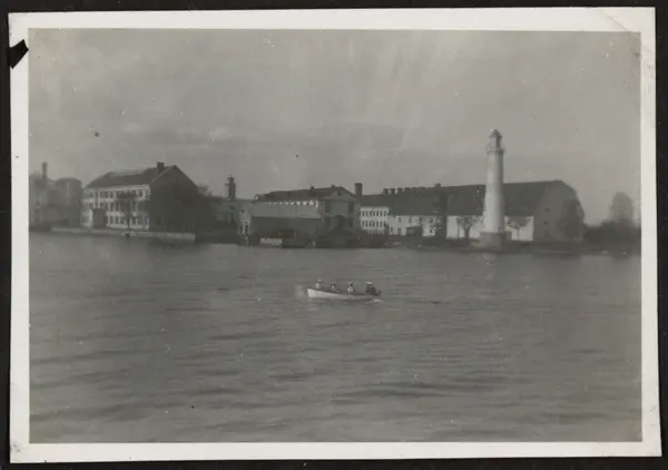 • Bilden föreställer en vy på Stumholmen från havet. I förgrunden befinner sig en roddbåt med sjömän.