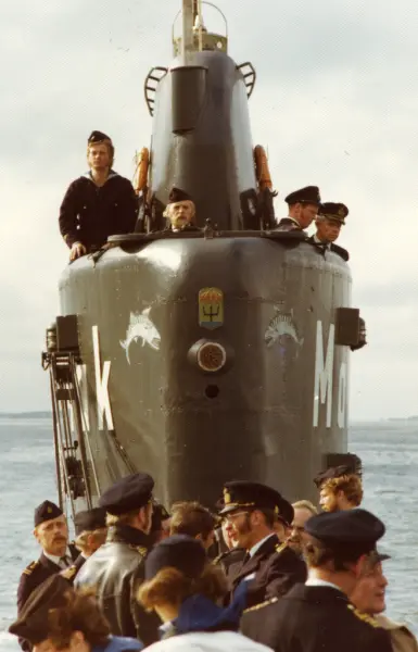 • Makrillen fylld med människor, både på däck och i tornet. Runt om ubåten syns vatten och i bakgrunden anas land. Text "Fredrik" på baksidan.