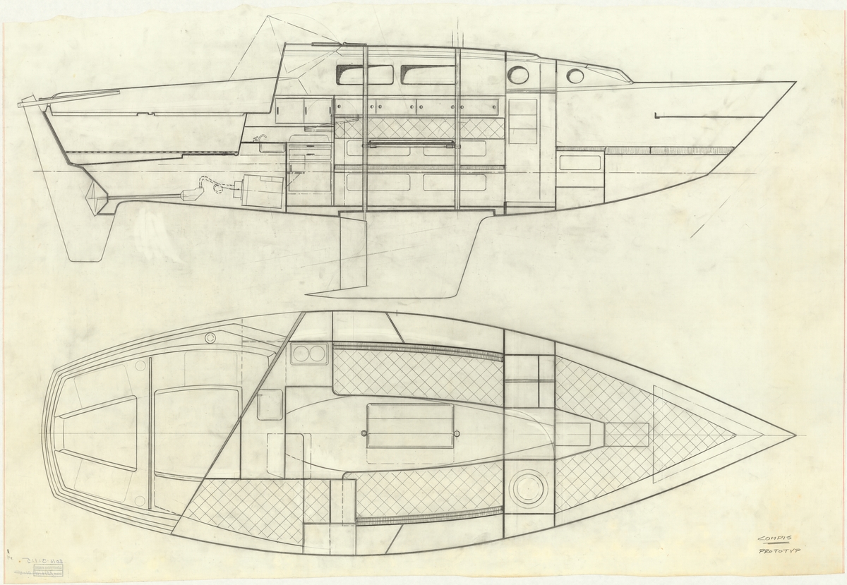 Konstruktören Bernt Andersson skriver: COMPIS Historien om Compis börjar sommaren 1968. Min fru var gravid och min finnjollekarriär i utförsbacken. En något äldre kanot- och finjollekompis, Sven Johansson, ringde mig och frågade om jag ville rita honom en familjebåt. Måtten hade han så gott som bestämt. Den skulle vara max. 8,5 meter lång för att den skulle rymmas i hans gamla ladugård. Han hade just byggt sig en kanadensare i plats och tyckte materialet verkade intressant och ville pröva något större. Jag kände mig direkt både hedrad och intresserad. Sven hade byggt både segelkanoter och finnjollar i trä och var erkänt duktig. Själv hade jag tidigare konstruerat några framgångsrika segelkanoter och även byggt ett antal finnjollar. Jag är utbildad maskiningenjör och har lyckats relativt bra som jolleseglare med bl. a. 2 st. NM i Finn som främsta meriter. Med tanke på projektets omfattning frågade jag om han inte borde skaka fram några intresserade medhjälpare och anmälde mig själv. Det var heller inga problem att hitta fler. Åke Stööd och Stig Johansson, även de gamla finnjolleseglare, behövde ingen större betänketid. Sommaren gick åt att läsa båttidningar och samla material. Det fanns inte så mycket att jämföra med. Jag sneglade lite åt Fingal, Vega och en bred fransyska från Dufor, men ville ju komma med något nytt. Det skulle vara en rejäl sittbrunn med rodret på häcken och invändig ståhöjd i hela ruffen. Ruffens lutande sidor var något nytt och de nedsänkta grabbräckena skulle göra att ruffen inte skulle se allt för hög ut. Den förskjutna ruffnedgången var också annorlunda. Semestern gick åt till de första linjeritningarna och att göra en lite trämodell. Steget från att ha ritat segelkanoter till havskryssare var ju ganska stort men inspirerande. På höstkanten var de flesta ritningarna klara. Vi fick den stora fördelen att på kvällar och helger disponera en snickerilokal där vi kunde tillverka mallar mm. När våren kom var allt klart att monteras i Svens ladugård där bl. a. bordläggningen skulle ske. Vi kunde snabbt konstatera att lagården var i alltför dåligt skick. Halmtaket läckte, invändiga spiltor och stöttor stod i vägen och råttor var det gott om. Det var ett riktigt bakslag, men Sven bestämde snabbt: Vi river skiten och bygger en ny lokal. Sagt och gjort, men inte så enkelt som det låter. Men som lantbrukare han var, var ingenting omöjligt. Han hade en egen skog och också ett eget sågverk. Vi sågade allt virke, gjöt betong, snickrade, klädde med plåt, drog el, isolerade och inredde ett helt nytt ändamålsenligt varv enligt mina ritningar. Det var många hårda dagar där Sven arbetade på heltid och vi andra så mycket vi kunde. Själv var jag något splittrad som nybliven pappa och fortfarande aktiv i finnjolle, med VM på Bermuda som verkliga utmaningen. På hösten 1969 var lokalen klar och det verkliga arbetet kunde starta. Skrovpluggen bordlades med lättslipade abachi-ribbor. Efter några timmars spacklande och slipande kunde formarna gjutas på senvintern 1970. Vi insåg att vi inte skulle klara få båten klar till den stundande sommaren om vi skulle göra allt arbete själva, så vi körde formarna till ett närliggande varv Väneröplast där det första skrovet laminerades. Själva kunde vi koncentrera oss på däcks-, roder- och kölformar. Den första kölen var mycket speciell. Längst ner på en gjutjärnsköl hade vi en blybulb utformad som en vinge (världens första vingköl?). I akterkant av kölen fanns ett trimroder, som via sin hjärtstock kunde regleras ovan däck. Hjärtstocken gick i en hylsa (däcksstötta) i akterkant på det invändiga bordet. Compis var ju först och främst avsedd som en rymlig familjebåt, men med några mindre justeringar i riggen kunde hon mätas in som halvtonnare, en klass som snabbt etablerat sig i Sverige med båtar som Scampi och Joker. Den första riggen köpte vi från Tyskland och de första seglen från Gransegel. En Farymandiesel med hydrauldrift var något nytt och placerades under sittbrunn. Compis blev det perfekta namnet. Tillsammans hade vi gjort något riktigt bra. Segelmärket, de karaktäristiska vingarna, är egentligen fyra kapsejsade finnjolleseglare. Prototypen sjösattes i början av juni 1970 och tog några dagar, därefter en meriterade andraplats i Vänern Race, dock utan mig själv som samtidigt seglade NM i finn. Sporrade av framgången i Vener Race anmälde vi oss uppkäftigt till Half Ton Cup som skulle gå i Sandhamn. Nu var det de andra tre som inte kunde ställa upp, så dit kom jag tillsammans med ett gäng jolleseglare som aldrig suttit i samma båt, aldrig hissat en spinnaker eller deltagit i en havskappsegling och som tyckte lyckan var fullständig när vi lyckats hitta fram till Sandhamn. Konkurrenterna log i smyg när vi till inmätningen kom med endast en genua och en spinnaker. Detta till trots hängde vi med riktigt bra och hade bara vindarna varit lite mer skonsamma mot oss nybörjare hade säkert placeringen blivit bättre. I sista seglingen låg vi länge bland de 5-6 första innan vi tvingades utgå. Nu gällde det att sammanfatta säsongen och se framåt. Intresset för båten var väckt, men vår budget sprucken med råge. För att få pengar att gå vidare beslöt vi att sälja prototypen. Den såldes till Evald Månsson från Malmö för rea-priset 35000 kr. Erfarenheterna från första året var lite blandade. Skrovet var helt OK, men den annorlunda kölen gav vissa tvivel. På platt vatten var den säkert effektiv, men när vågorna växte fick jag en känsla av att kölen sög. Det fina trimrodret såg vi aldrig någon större effekt av. Hela kölkonstruktionen var dessutom ganska dyr i produktion, så jag fick tänka om och göra något mindre extremt. Masten, som på prototypen, stod på däck, förlängdes och ställdes på kölen. Hydrauldriften fungerade hyfsat och var en
