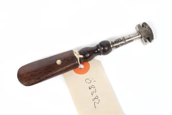 Diamant, glasmästar-, med polerat och svarvat skaft av mahogny. Skaftet kronstämplat och märkt "5 samt försett med en infälld liten benskiva. Diamanten nedsliten. Graverad sol på sidan av järnet.