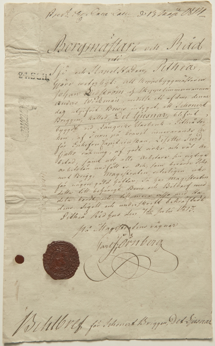 "Borgmästare och Råd uti Sjö och Stapelstaden Pitheå gjöre weterligt: att skeppsbyggmästaren Johan Lidström och skeppstimmermannen Anders Wickman, medelst ett af dem denna dag utgifvit Bewis intygar att Schonert Briggen kallad Det ljusnar, blifvit byggd vid Långviks Glasbruk i Pitheå socken, af Furu på kravel innevarande år för Enkefru Capitainsenkan, Lisette Turdfjaells räkning, af godt virke och väl arbetad, samt att alla arbetare sin rigliga arbetslön undfått av och, som bevärde schonert brigg magistraten säkerligen icke för någon gäld häftar, så har magistraten detta till behörigt bevis och bilbref meddela bordt och till mera visso med stadens sigill och underskrft bekräftadt. Piteå Rådhus den 7 de julii 1813"