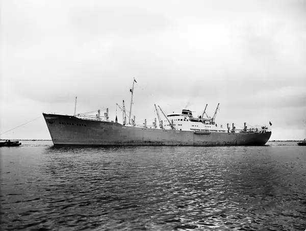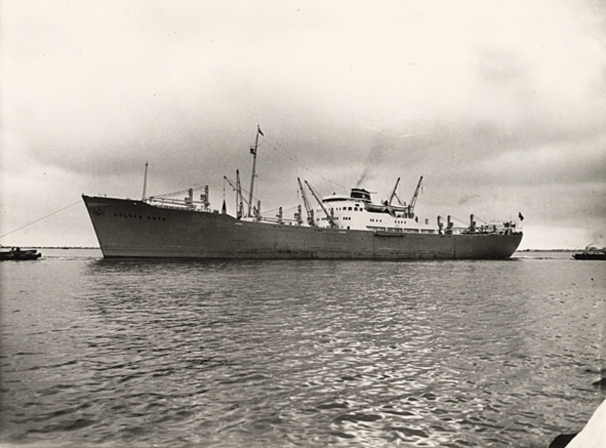 • Foto i svartvitt visande lastmotorfartyget "GOLDEN GATE" i Köpenhamn den 1.5.1956.
