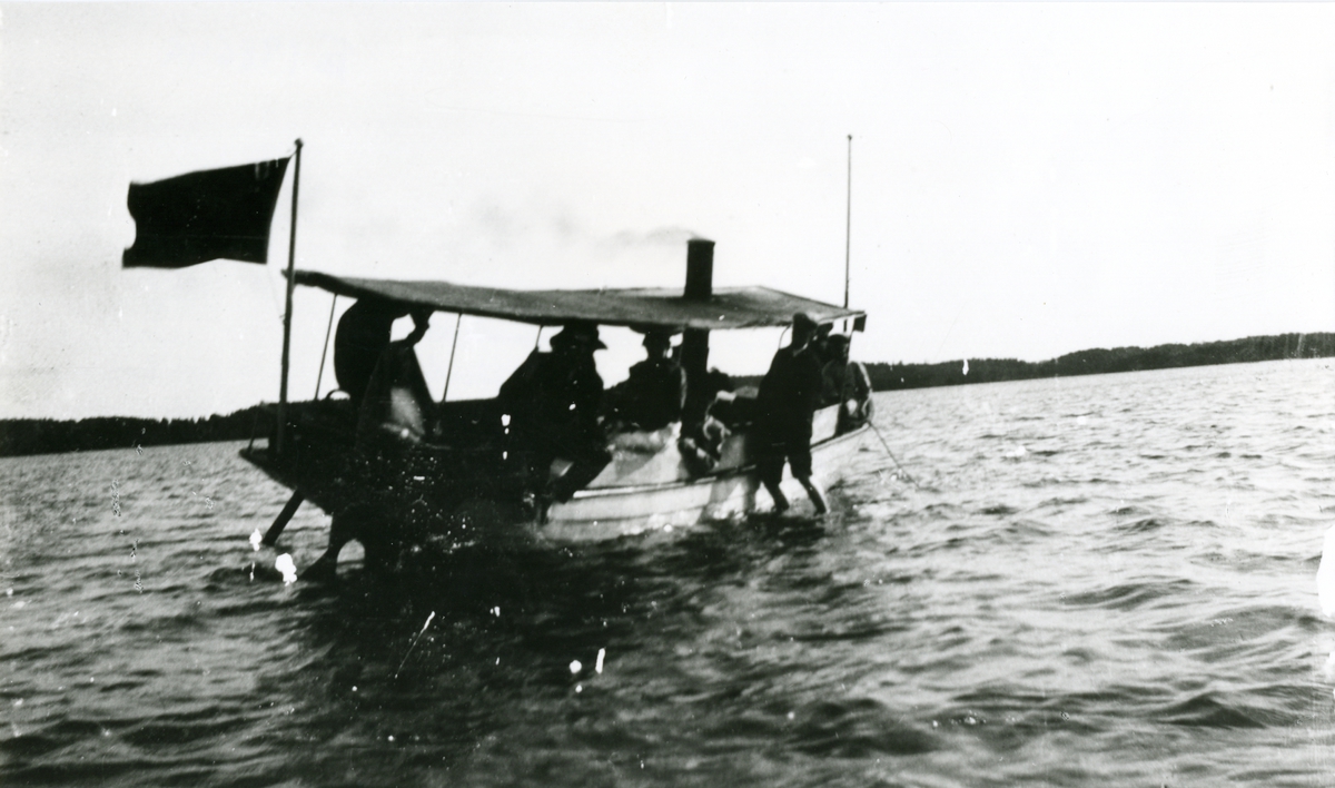 Fotografiet ingår i Kärrbo Hembygdsförenings samlingar.....Ångslupen Rex.....ägare patron N. J. Johansson, Frösåker [och] som gjorde affärsresor t ex till Örsundsbro med Rex. Här på utflykt.och grundstött... I vattnet sonen Gerhard Johansson.