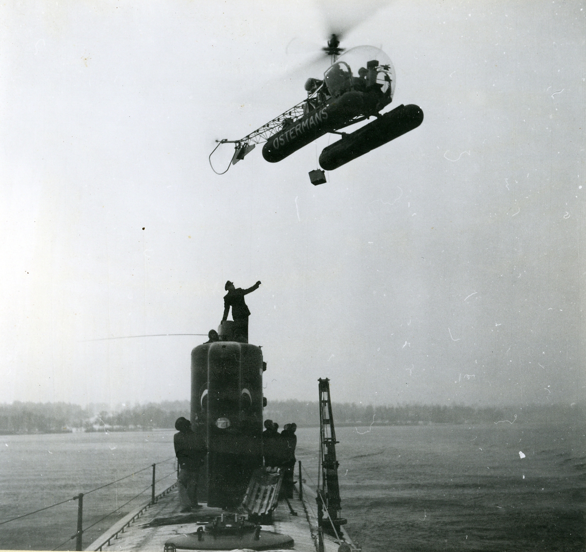 Helikopter fotograferad när den firar ner reservdelar till en ubåt.