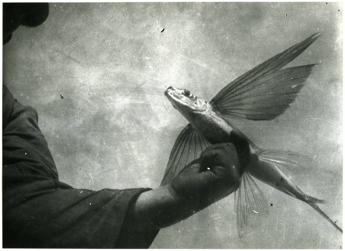 "En fångad flygfisk ombord på S/S Margit den 16 april år 1925. Position 26 grader N och 16 grader V."