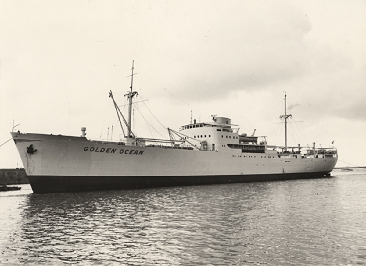 • Foto i svartvitt visande lastmotorfartyget "GOLDEN OCEAN" i Köpenhamn under år 1954.