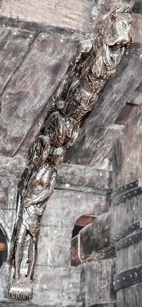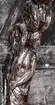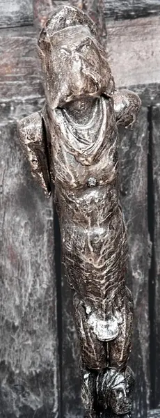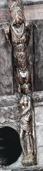 Text in English: Long and slender sculpture with the upper section shaped as a Triton and the lower as a Caryatid.