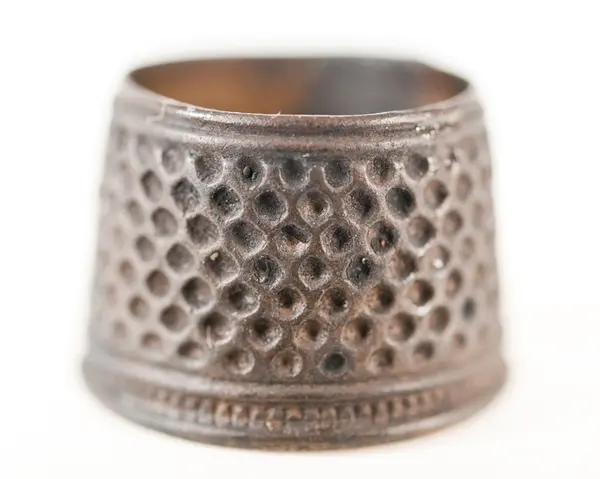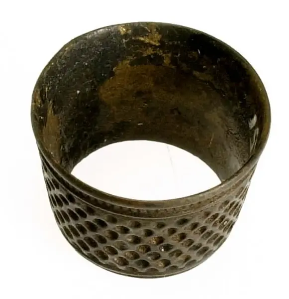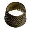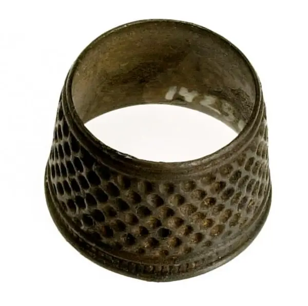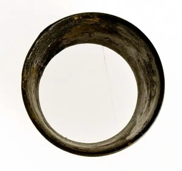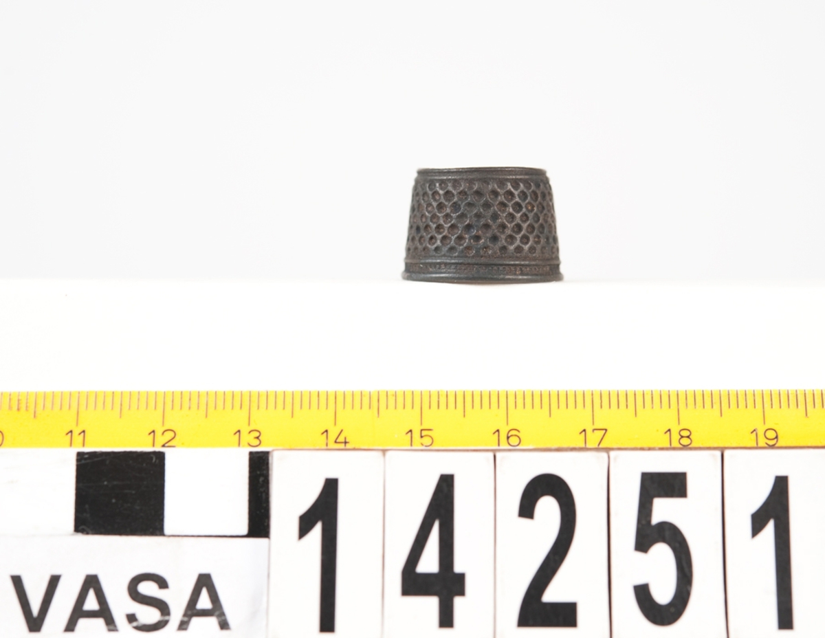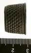 • En syring av mässing. Öppen i bägge ändar. Konisk form. Punsat heltäckande mönster. En mönstrad samt en enkel rand runt den vidare änden. En enkel rand runt den andra änden.