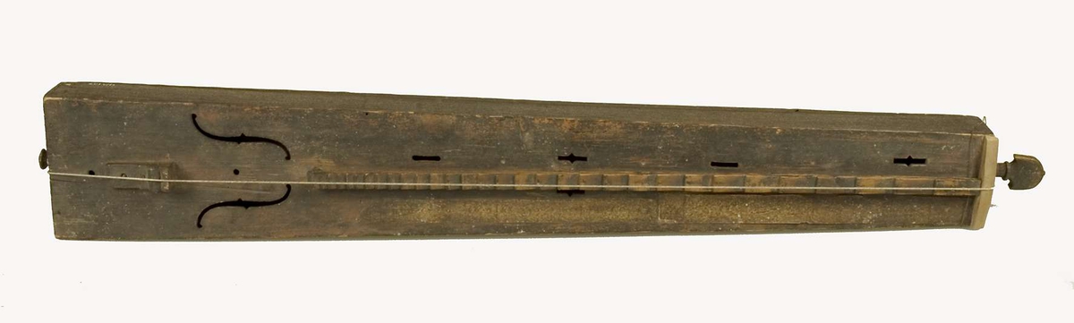 Psalmodikon av brunmålat trä. Sinkade hörn. Sträng tillverkad av tarm, fästad runt träknapp. Stallet profilerat. Nedre ljudhålen f-formade, de fyra övre rektangulära. Klistrat papper med tecken för fingrets placering på avbalkningen.