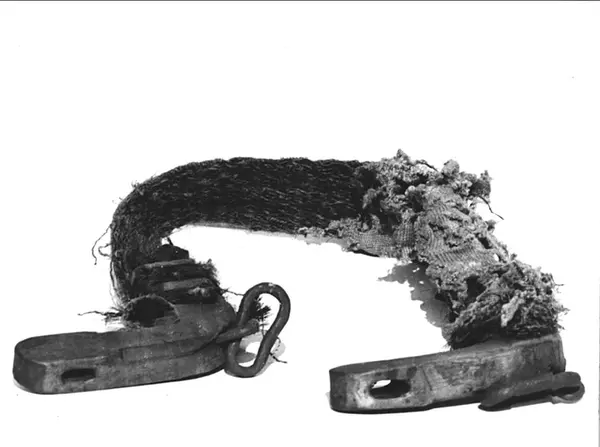 • Två selknän som är förenade med en bukgjord av tagel, lagad med stickat ylle. Rödfärgade.