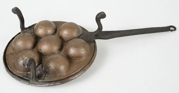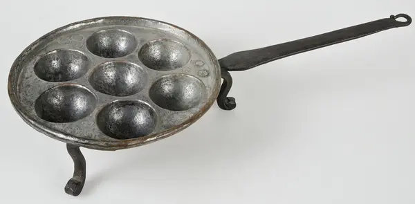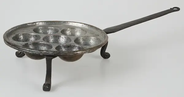 • Munkpanna av koppar. Kanten omböjd kring an järnten. Ben av järn. Förtennat inuti.