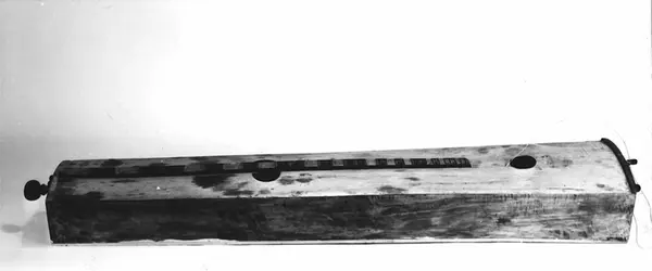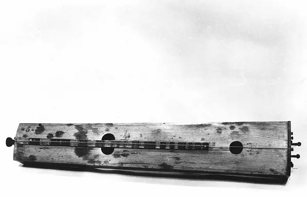Psalmodikon av ljust lackat träslag med mörkare fläckar, förmodligen av bets. Avbalkningsbräda med vissa partier svartmålade. Metallklamrar åtskiljer varje avbalkningsdel. Ristade tontecken. Ovan dess...