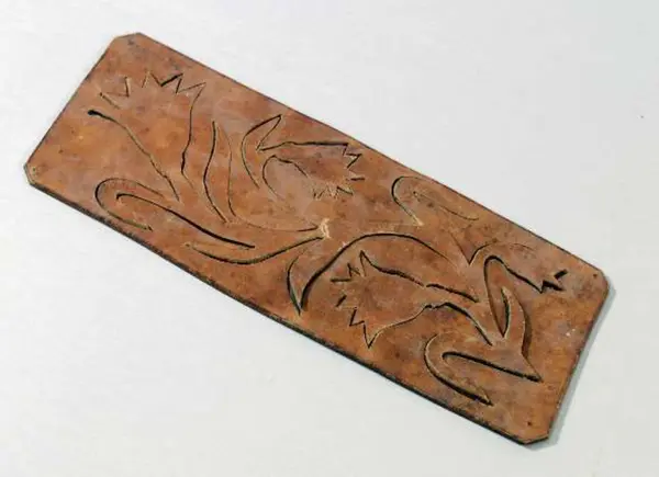 Enligt uppgift stans för pressning av servetter. Har tillhört givarinnans far, grosshandlare Bernhard Littorin, Uppsala, född 1839, student 1856, genomgick Falu bergsskola och Ultuna, sedan handlande och ägare av gården, Drottninggatan 4 (efter fadern), död 1890. Gåva 1935 från Eva Lövgren, född Littorin, Uppsala.