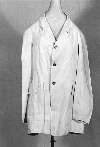 • Rock av oblekt linnelärft. Ryggen svängd och skuren i fyra våder. Knäpps med tre tennknappar. Sprund. Ofodrad.