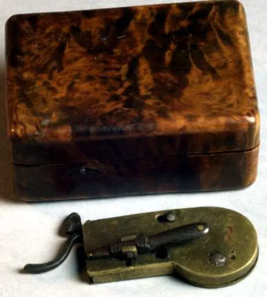 • Ådersnäppare av mässing med kniv och fjäder av järn. Till ådersnäpparen hör ett etui av masurbjörk (UM10486c).