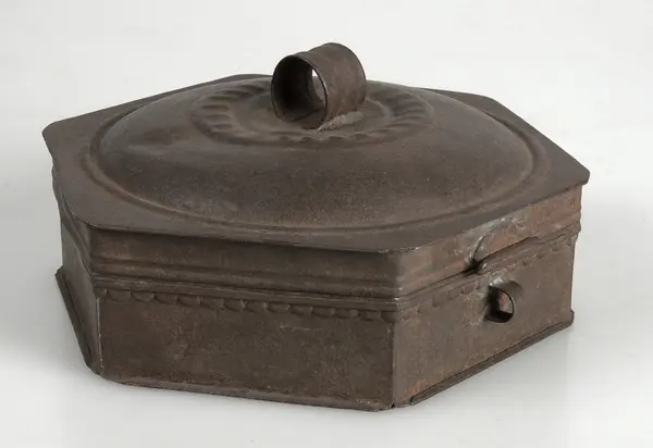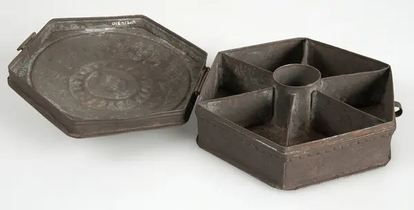 • Sannolikt ett kryddskrin, av bleckplåt. Inuti sex kantiga fack och ett runt fack i mitten.