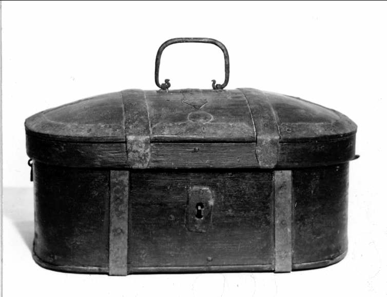 Svept matsäcksskrin med välvt lock, järnbeslag, handtag på locket, små ringar i sidorna. Svarttjärat.
