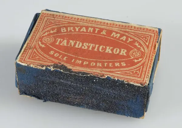 • Blå ask, på ovansidan påklistrat firmamärke i rött tryck "BRYANT & MAY, TÄNDSTICKOR, SOLE IMPORTES." Innehåller tändstickor.
