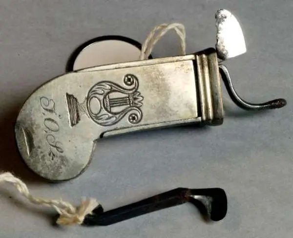 • Ådersnäppare med graverad dekor och initialerna "I.O.S.". Lös extra kniv. Tillhörande ask klädd med mörkrött skinn och fodrad med svart plysch UM06236.
