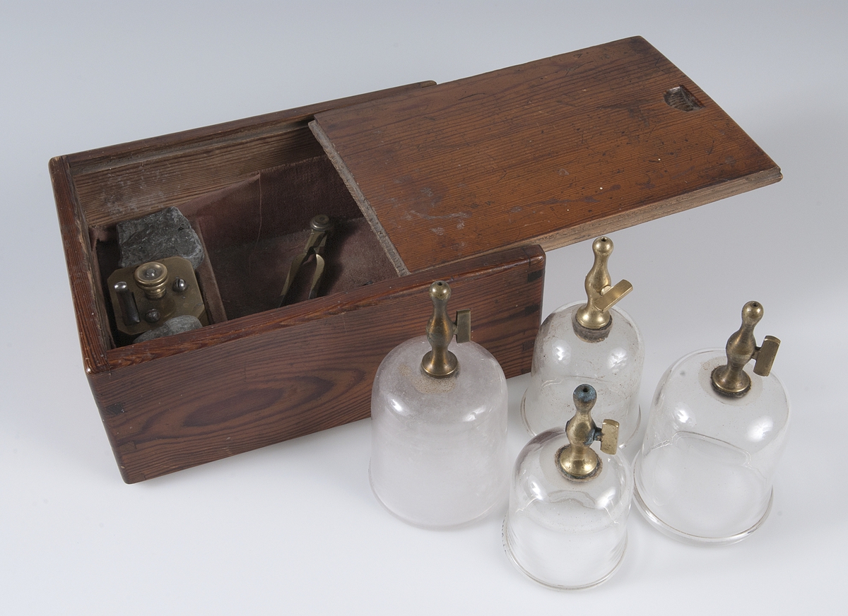 • En ask (a) av trä, med skjutlock, laserad i rödbrun färgton, invändigt klädd med rött plyschtyg, med följande innehåll: en ådersnäppa (b) av brons och järn, en koppsnäppare (b) av brons och järn, stämplad 907 och ALBERT STILLE STOCKHOLM, två stenar (a), sannolikt av alun samt tre koppglas (c) i två storlekar. Till gåvan hör också ett löst koppglas (c). Måttangivelserna gäller asken.