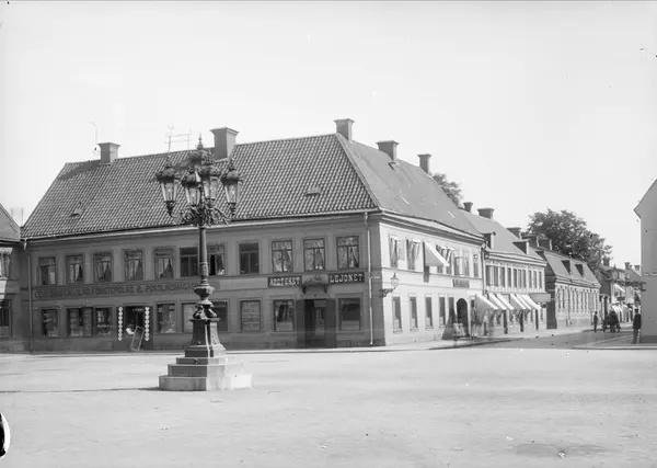"Det s k Lokkska apotekshuset vid Stora torget uppfördes omkring 1770 av apotekaren Christian Ludvig Lokk. Lokk anställde Carl Wilhelm Scheele som biträde i sitt apotek, Uplands vapen. På 1890-talet Ändrades apotekets namn till Lejonet, efter kvartersnamnet. Huset revs 1960 och ersattes av nuvarande Tempo-huset. I bakgrunden ses bland annat de Geerska gården." Ur Ola Ehn & Gunnar Elfström, Sekels...