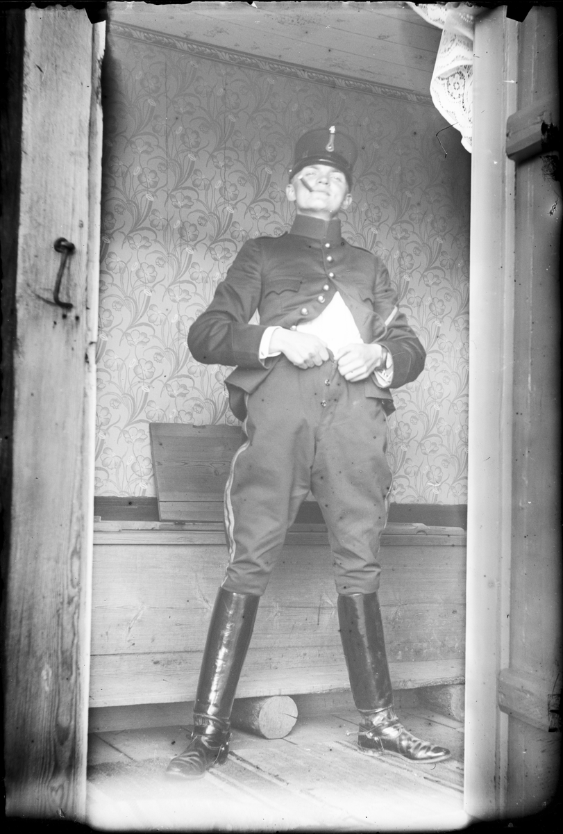 Man iklädd uniform poserar med cigarr på avträde
