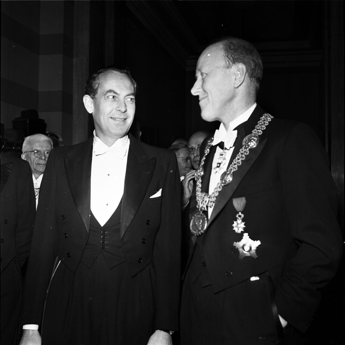 Rasbiologens nye chef Jan Arvid Böök tillsammans med Uppsala universitets rektor Torgny Segerstedt i Universitetsaulan, Uppsala 1957. I bakgrunden professor Nils von Hofsten