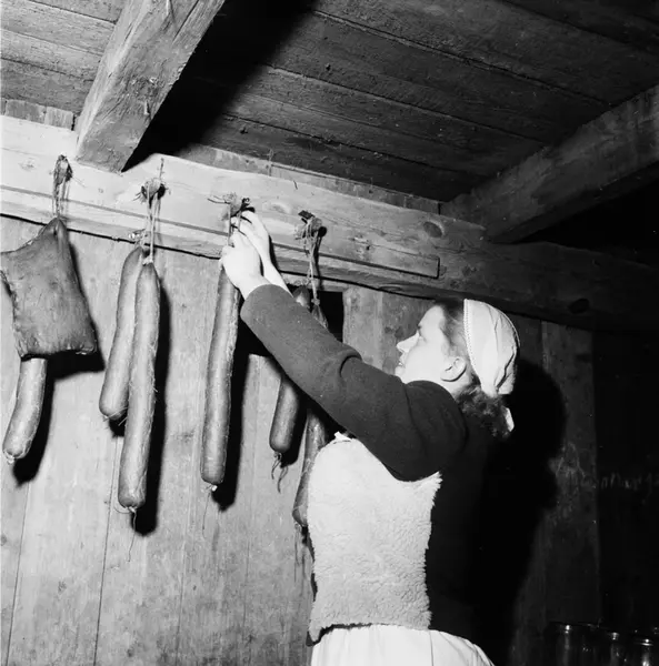 • Blivande lanthushållslärarinnan Millan Bengtsson hänge upp rökt korv i matboden, Eke gård, Vaksala