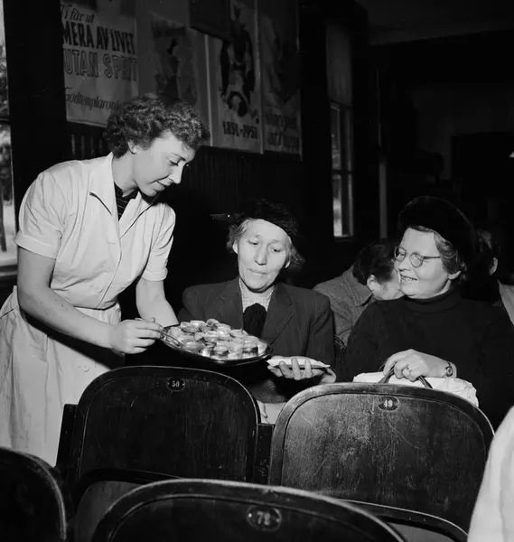 Bilden är publicerad i Upsala Nya Tidning 4 december 1952 med följande bildtext: "Därunder demonstrerar assistent Nissan Wikström ett fat med gravad sill för fruarna Agnes Sjöberg och Sally Andersson....