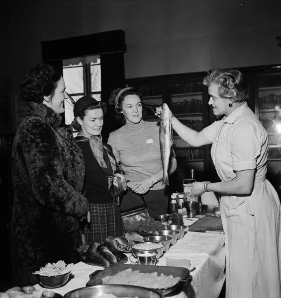 Om husmors hälsa, fisken i kosthållet och konsten att göra hushållspengarna dryga Informerade konsulent May Liljegren husmödrar i Månkarbo, Tierp 1952. Hon arbetade på uppdrag av föreningen Fiskpropaganda i Göteborg och hade rest runt i Uppland under en månads tid. Husmödrarna fick bland annat lära sig att det finns minsann åtskilligt mer att bjuda make och barn än stekt eller kokt torsk. Ingrid Sandström, Eivor Åkesson och Bibi Floderus blev fotograferade tillsammans med May Liljegren när hon berättade att så skall en vitling se ut.