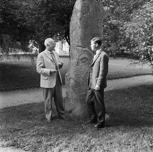 Uppsalarkeologer tillbaka från grävsommar på Irland, Mårten Stenberger vid runsten, Uppsala 1961